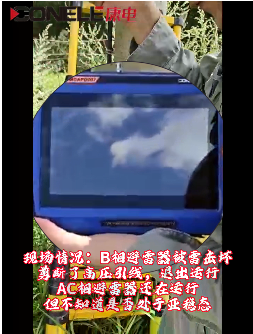 现场情况:B相避雷器被雷击坏,剪断了高压引线,退出运行;AC相避雷器还在运行,但不知道是否处于亚稳态。